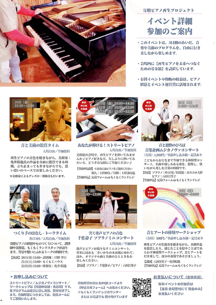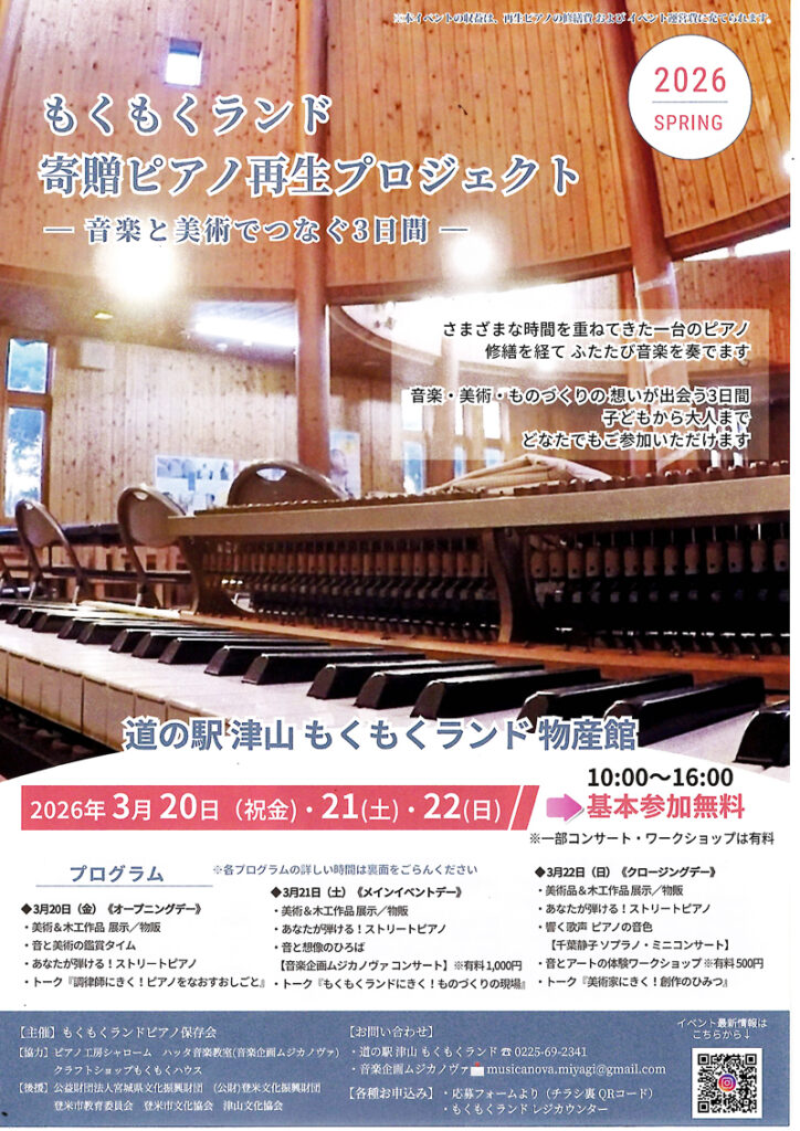 道の駅津山もくもくランドでイベントがあります。2024年9月に仙台市内のカフェサテンドール・岡崎様からもくもくランドに寄贈いただいたグランドピアノは搬入経費と修繕を合わせて、それなりの経費がかかりました。この度「音楽企画ムジカノヴァ」様による、ピアノを再生し維持するためにも、皆様にお楽しみいただけるイベントを企画していただきました。