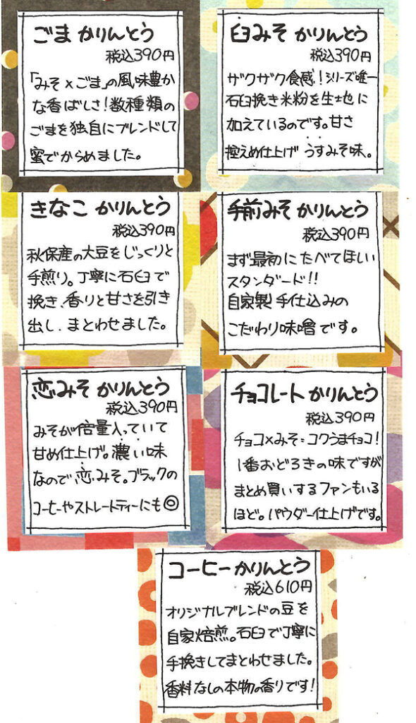 秋保のかりんとうはしばらく前から個人的にも好きで秋保に行ったときに購入していました。7種類あって購入するときに迷います。そんなときは全種類を買います!!