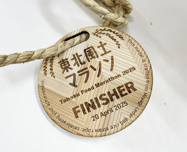おもしろい使い方で完成したのが東北風土マラソンの記念品に使ったメダルです。文字が小さいのと文字数がとても多いので直径を10cmに仕上げました。この場合はメダル以外にコースターで使う記念品もありかな、と思います。