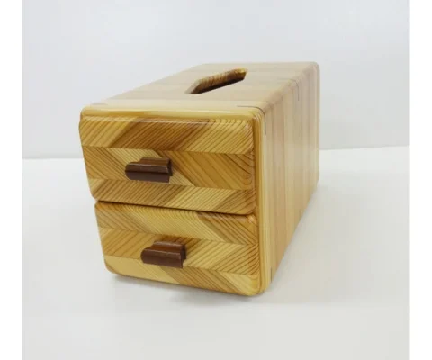 ルーターを使って加工した、だ円トレーや角トレーが人気作品。 小引き出し、アクセサリーチェストなど箱物も得意としています。 二段の引き出しタイプのペーパーチェストは、ギフトなどにとても人気があります。 最近はだ円の小皿やおしぼり置きなど食卓小物の製作もしています。