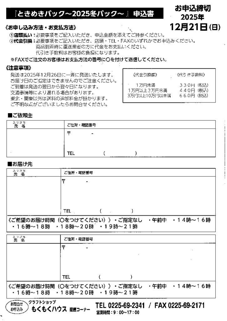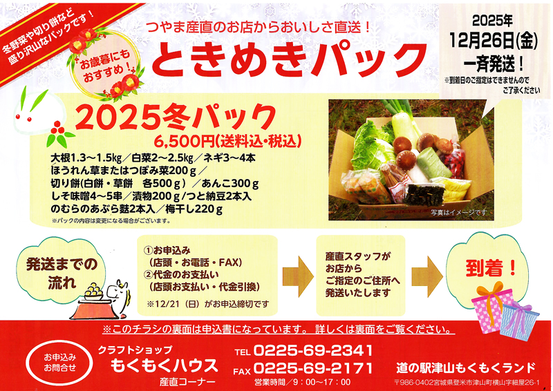 もくもくランド産直コーナーのときめきパックの受付が始まっています。年末パックとしても毎年人気です。お正月セットとして、産直野菜のほかに切り餅やあんこ、しそ巻き味噌、つと納豆、油麩、漬物などが入ったふるさとの味詰め合わせです。気軽にふるさとの味が楽しめるセット。ご注文はFAXでも受付可能です。もちろん贈り物だけではなくご自宅用にも配送可能です。発送は12月26日となっております。