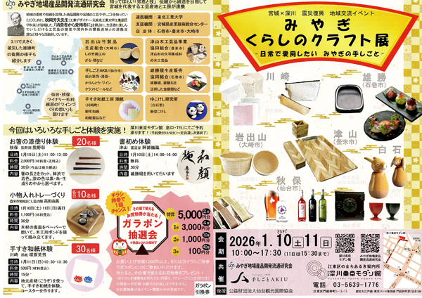 仙台箪笥、漆器、白石ゆこけし、しの竹細工、柳生和紙、津山の木工と秋保のワインとビール。