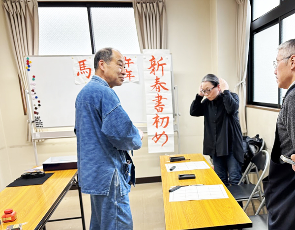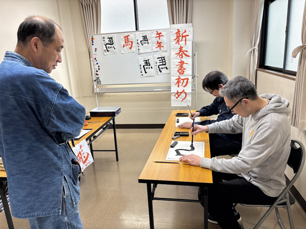 午後には書初め書道教室(参加無料)があり、ことしの「馬」をひだり馬に書くチャレンジがありました。