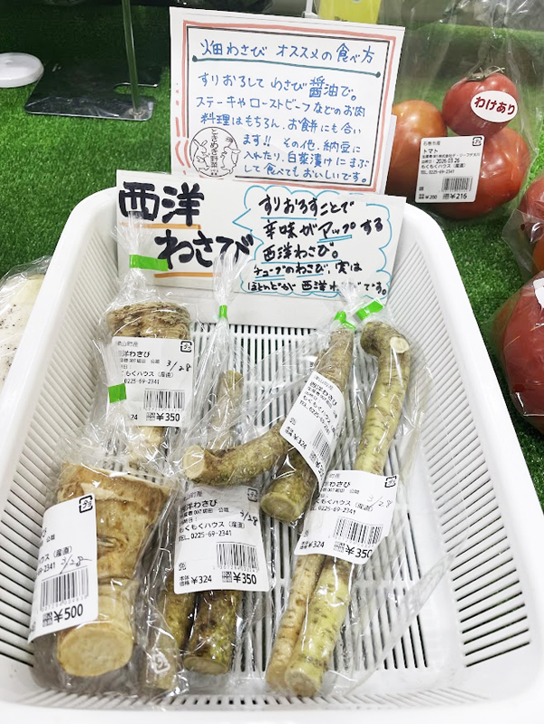 最近は「西洋わさび」の入荷があります。畑わさびのおすすめの食べ方は、すりおろしてわさび醤油で。